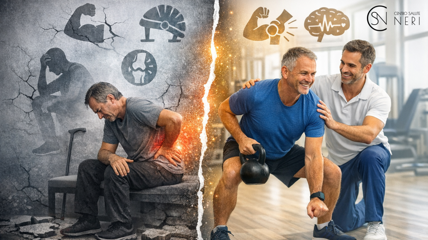 Il dolore è un segnale. Non sempre è un danno. Molto spesso indica che il corpo non è più allenato a gestire i carichi della vita quotidiana: stare seduti, sollevare pesi, camminare a lungo, lavorare, fare le scale. Quando smetti di muoverti succede qualcosa di preciso: